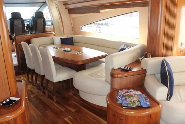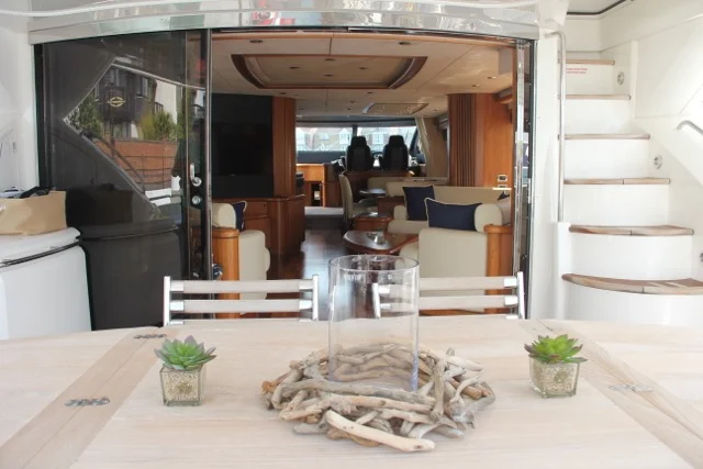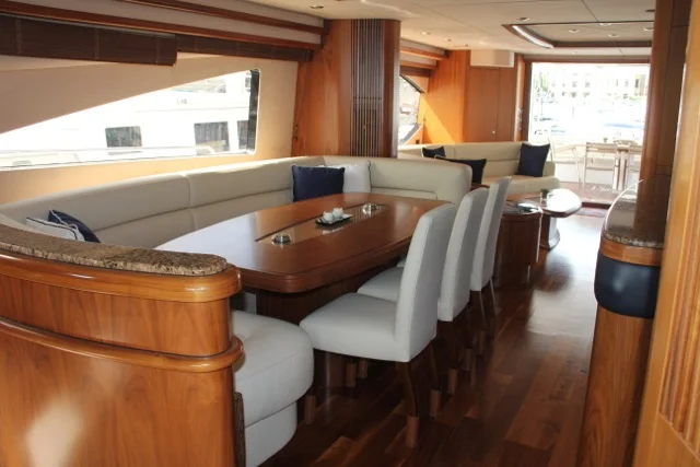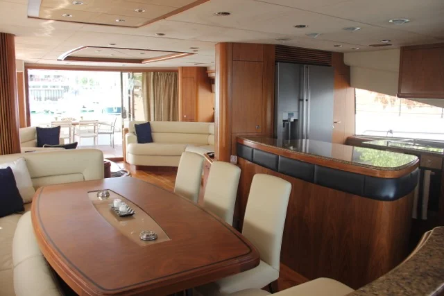 Maroma IV boasts a lovely warm interior with style and casual elegance. Rich American walnut wood panels and fine furnishings provide a welcoming ambiance. The salon features wood floors, 2 large V shaped leather sofas, a coffee table and panoramic windows for ample natural light. Forward in a semi open plan, the formal dining table sits adjacent to the galley, where guests can watch the chef create masterpiece meals.